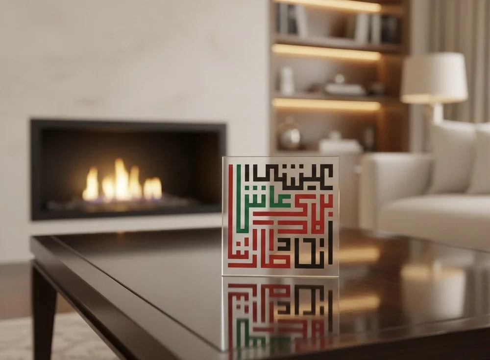 Elevate your home or office décor with this beautifully crafted 2D flat acrylic crystal block, featuring a bold and modern Kufi calligraphy design inspired by the Emirati National Anthem. Printed in the UAE national colors—red, green, black, and white—this piece blends contemporary minimalism with deep cultural significance.