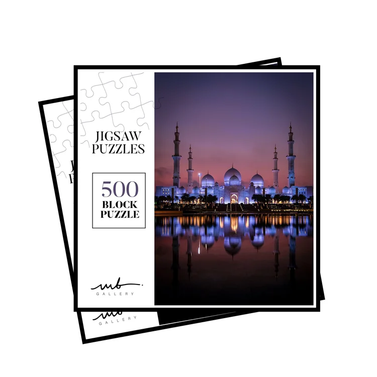 Immerse yourself in the beauty of the UAE with this premium 1000-piece jigsaw puzzle showcasing an original photograph captured by Muna Balfaqeeh. The image highlights the serene elegance of the UAE’s iconic architecture at sunset, reflected beautifully across still waters—a scene that transforms into a calming, engaging puzzle experience.